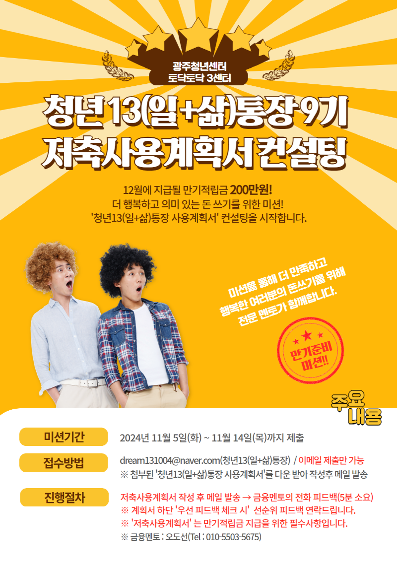 PS. '청년13(일+삶)통장 저축사용계획서컨설팅‘ 으로 더 만족하고 행복한 여러분의 돈 쓰기를 위해 전문 멘토가 함께 합니다.