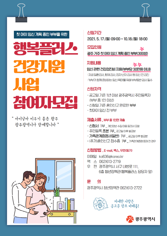 아이낳아_키우기_좋은_광주만들기 위해 광주광역시에서 첫 아이 임신 계획 중인 부부 300쌍에게 부부당 30만원 이내의