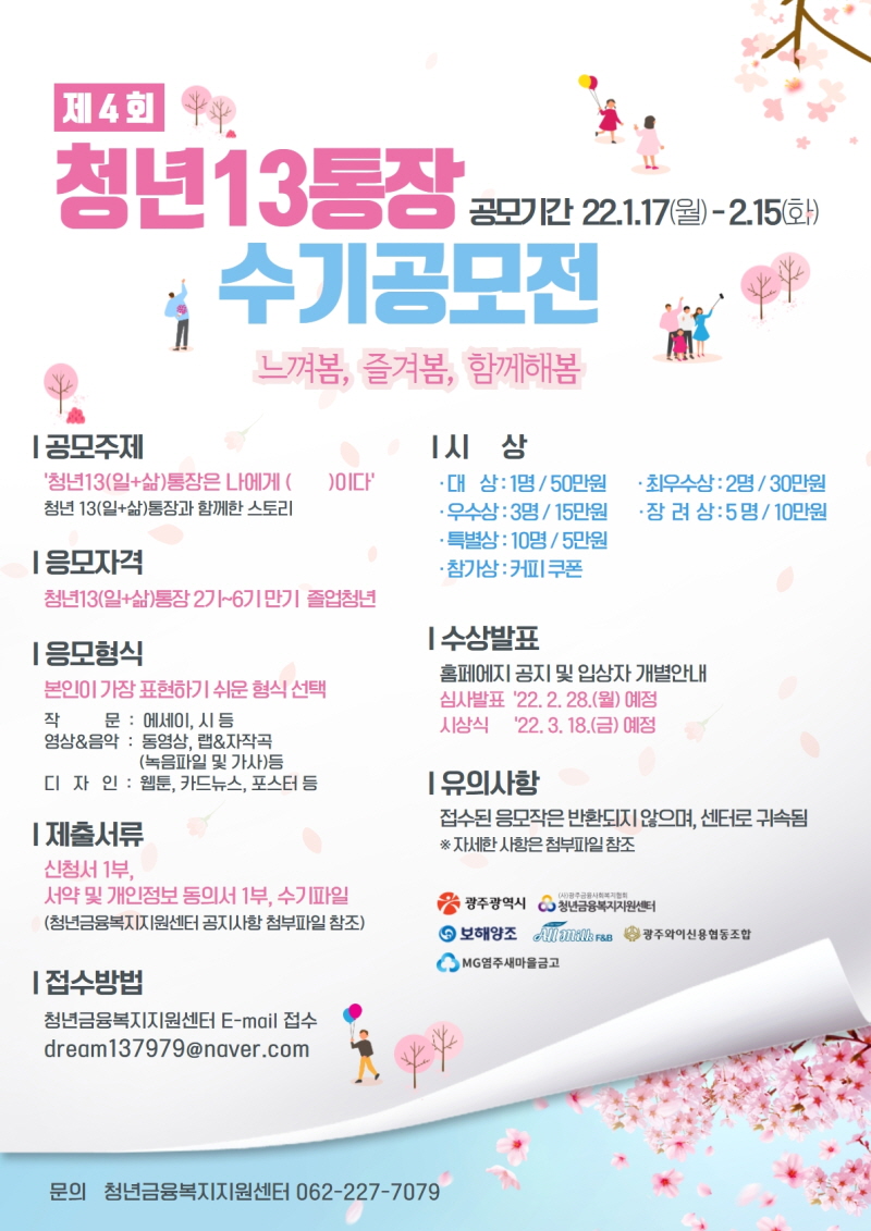 3. 응모자격 : 광주 청년13(일+삶)통장 2기 ~ 6기 만기 졸업(예정) 청년
